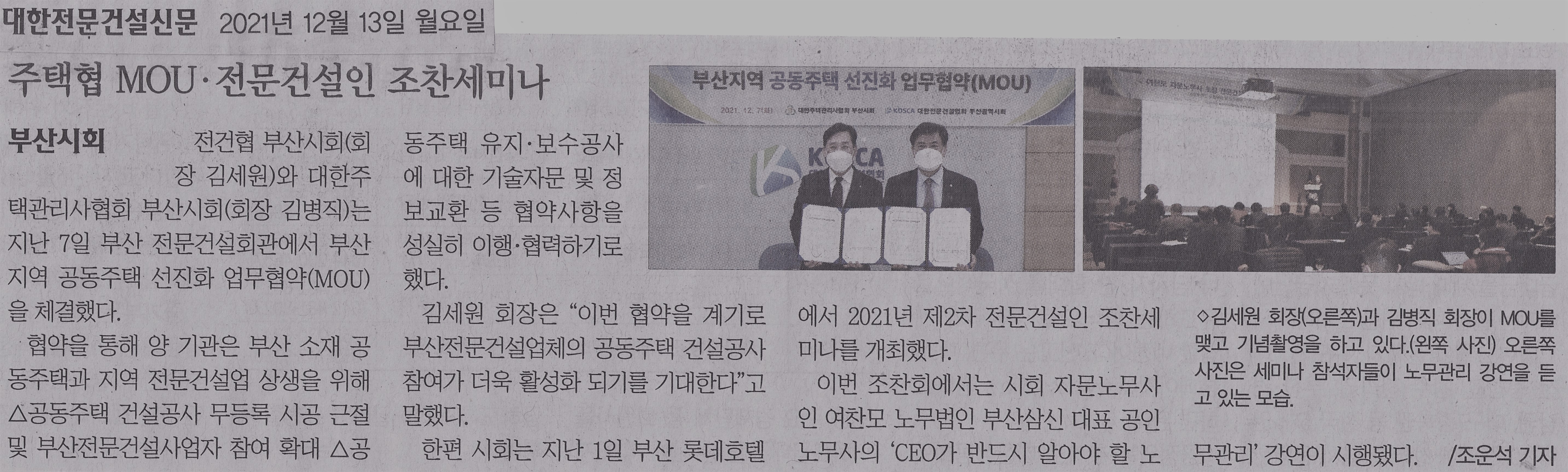 대한주택관리사협회와 MOU체결, 전문건설인 조찬세미나 개최