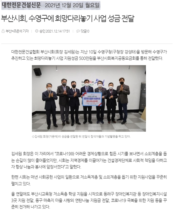 대한전문건설협회 부산광역시회 회장 김형겸입니다.